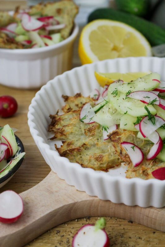 Tada įdėkite bulvinius blynus į 180 laipsnių C orkaitę ir kepkite maždaug 20 minučių. Paruoškite padažą. Į dubenį supjaustykite šviežius agurkus ir ridikėlius ir suberkite smulkintus krapus. Pagardinkite citrinos sultimis, druska, aitriąja paprika, pipirais ir medumi. Kai blyneliai bus paruošti, leiskite jiems kelias minutes atvėsti ant kepimo skardos, tada atsargiai išimkite iš skardos ir patiekite su aparuoštu padažu. Mėgaukitės iš karto arba laikykite sandariame inde šaldytuve.