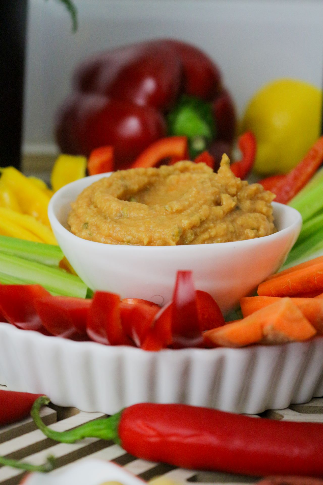 Traškios daržovės su keptų pomidorų humusu