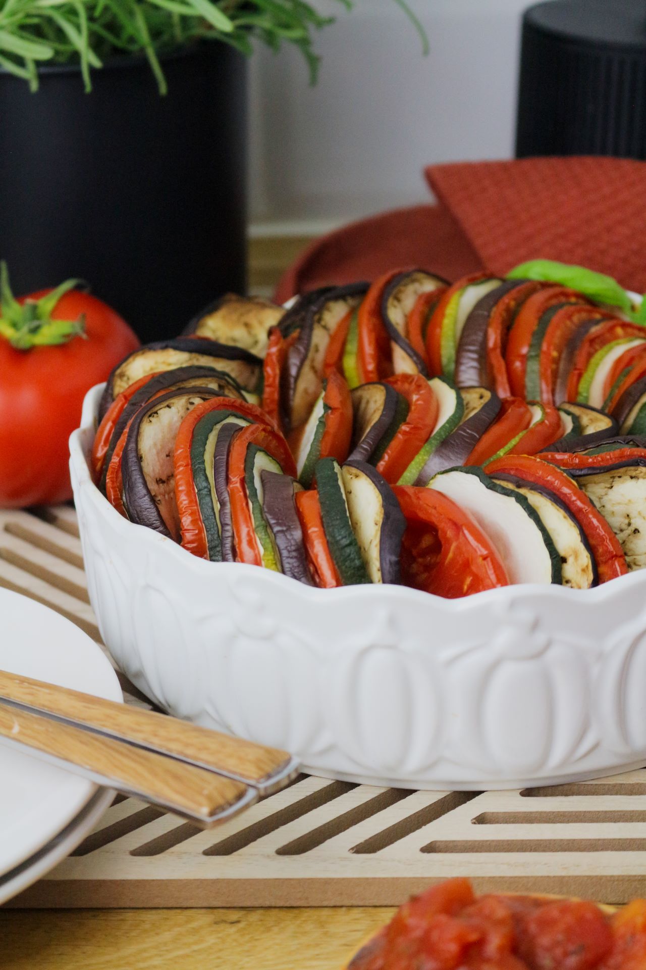 Tai klasikinis prancūziškas patiekalas, žavintis savo paprastumu ir spalvingumu. Orkaitės lėkštėje susitinka prinokę pomidorai, subtilios ir gaivios cukinijos bei nuostabiai violetinės spalvos baklažanas – kiekvienas gabalėlis yra atskiras meno kūrinys. Tai patiekalas, kuris ant stalo suteikia namų jaukumo ir kartu Viduržemio jūros regiono elegancijos.
