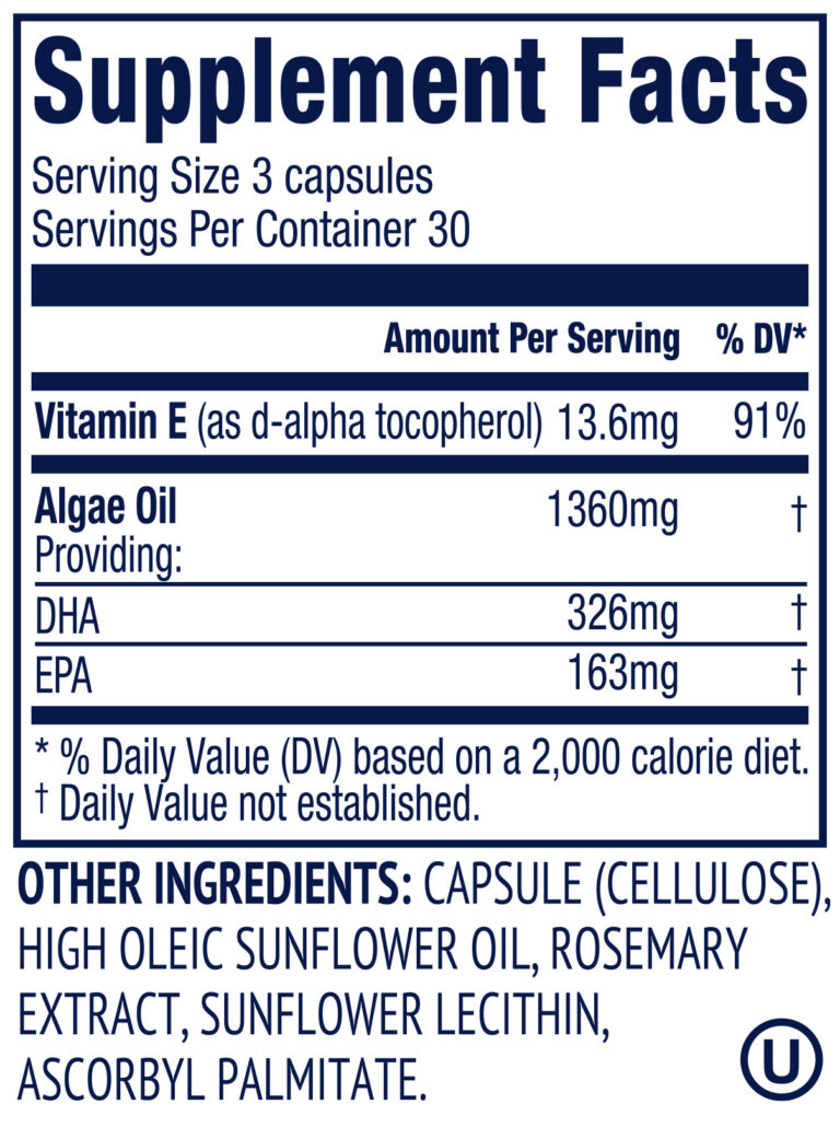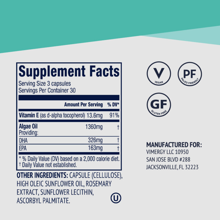 Jei ieškote aukštos kokybės EPA/DHA papildo be žuvų, štai jis! Vimergy Vegan Omega 3. Vimergy Vegan EPA/DHA sudėtyje yra 163 mg EPA (eikozapentaeno rūgšties), 326 mg DHA (dokozaheksaeno rūgšties) ir didelis kiekis antioksidanto vitamino E. Nebereikės rūpintis, ar gaunate pakankamai omega 3 riebalų rūgščių – tiesiog išgerkite kelias kapsules ir tęskite dieną.