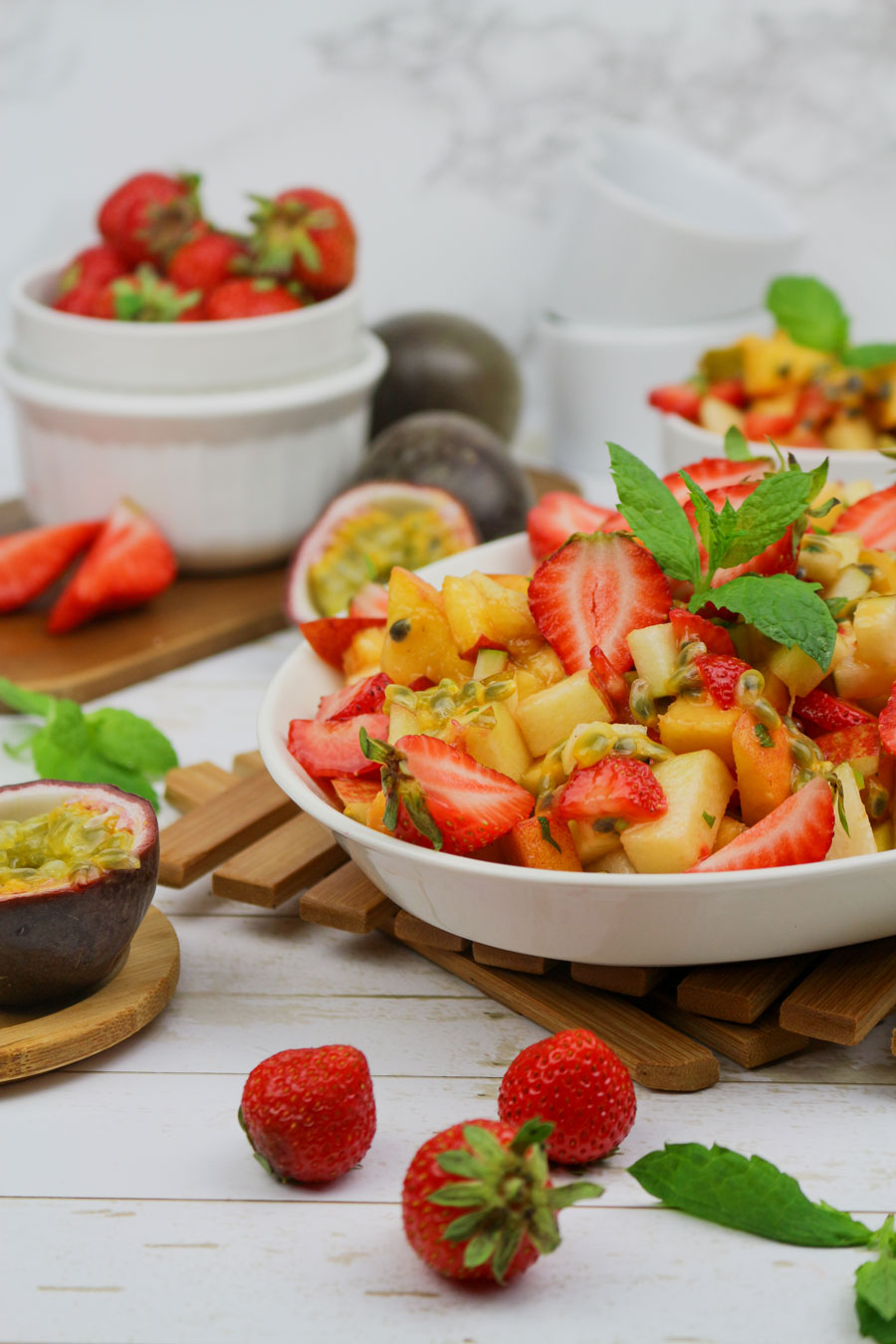 Tropinių skonių vaisių salotos su pasiflorų ir mėtų padažu